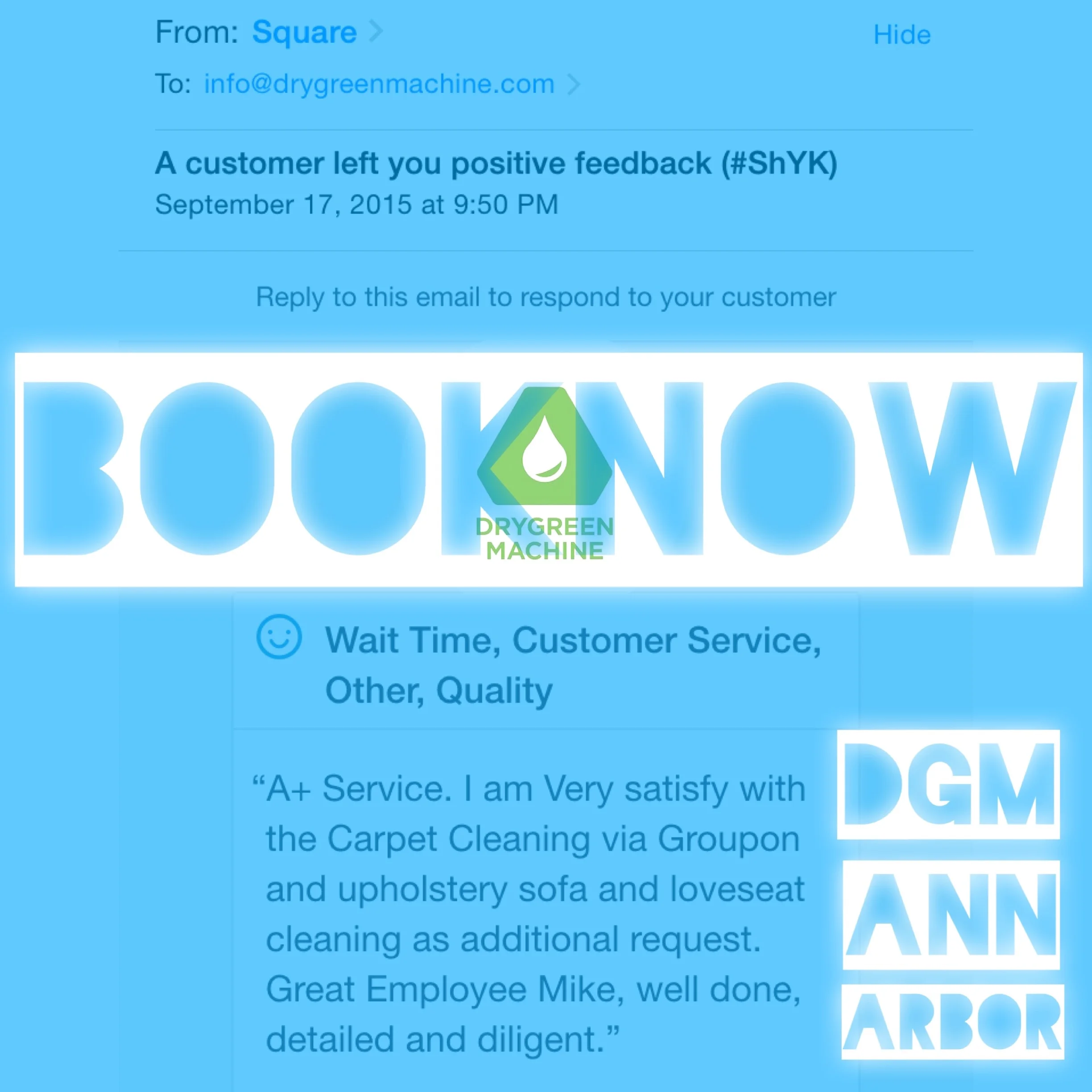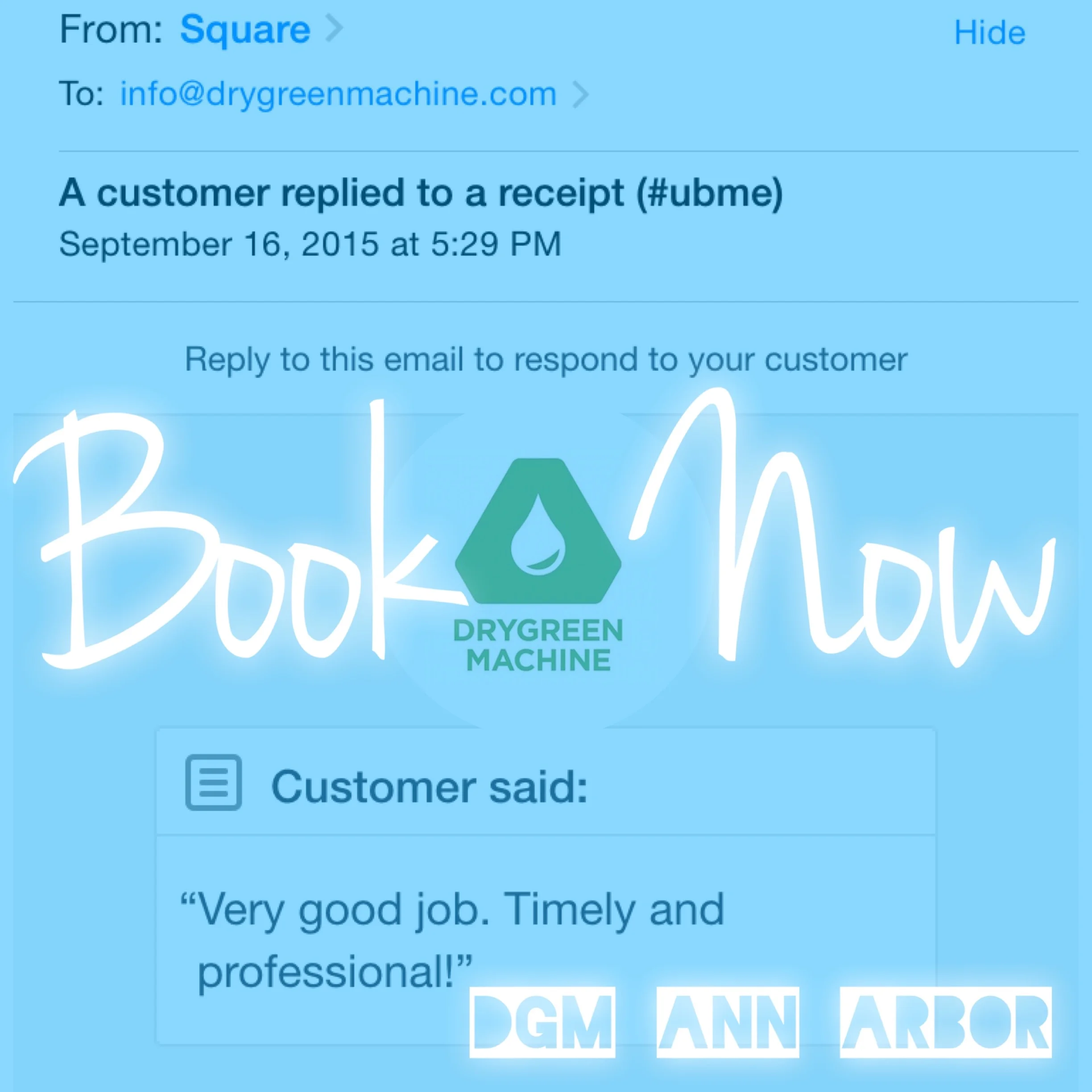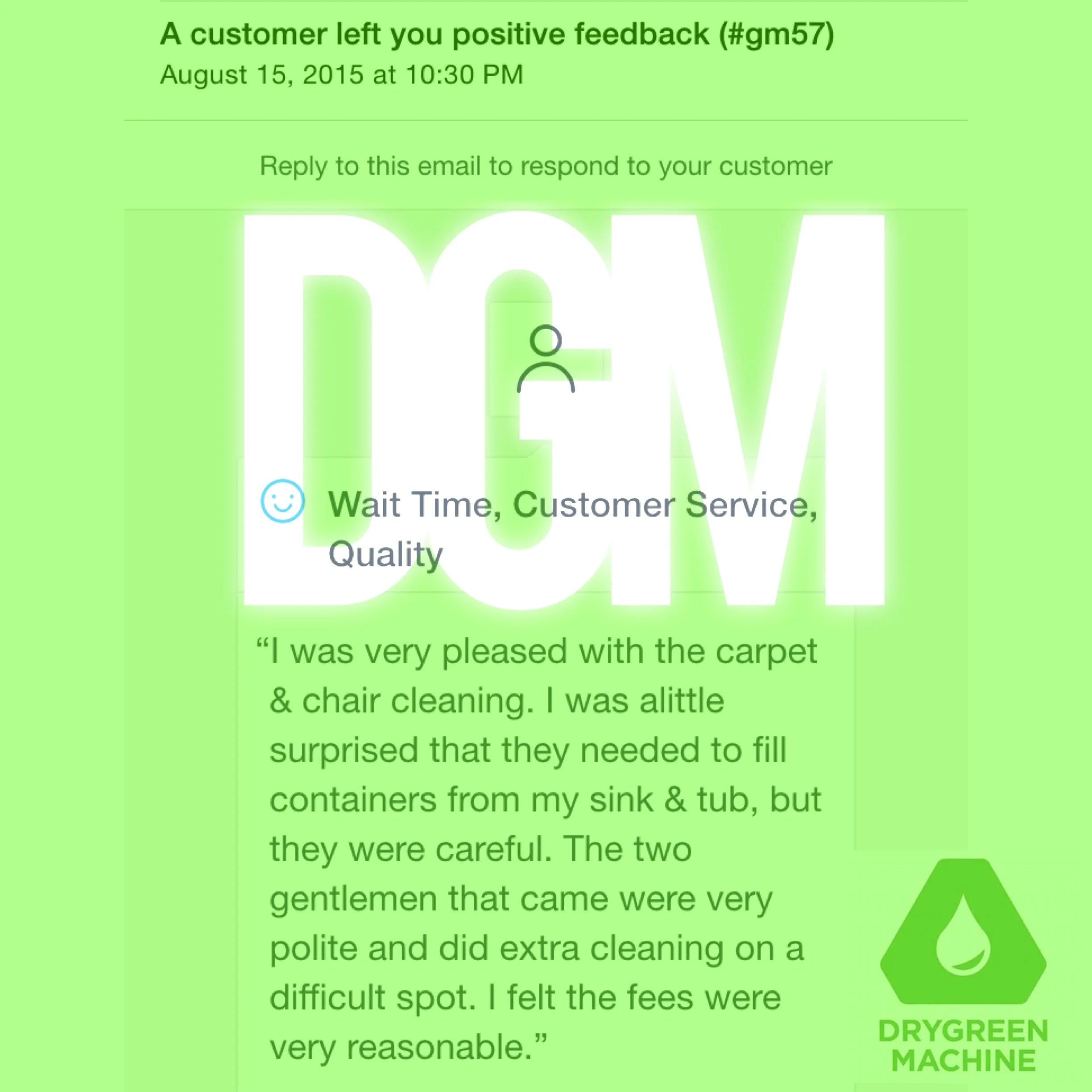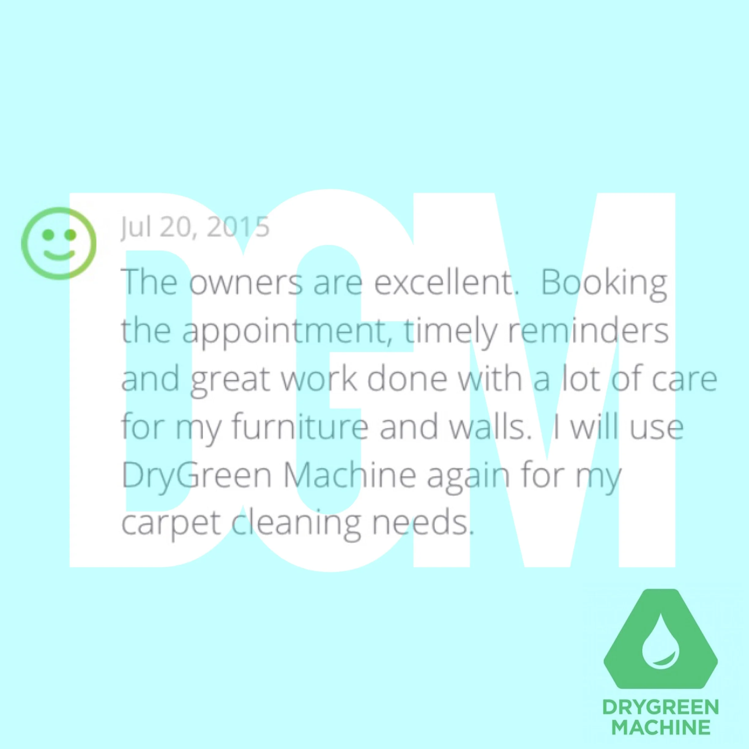 “I found DryGreen Machine online and held my breathe. Co-owner Mike came to my office and did a great job. The appointment was easy to book on-line, the reminders were timely and then a 30 minute out call were all greatly appreciated. My office looks great again. I will definitely use this company again for home and business!”