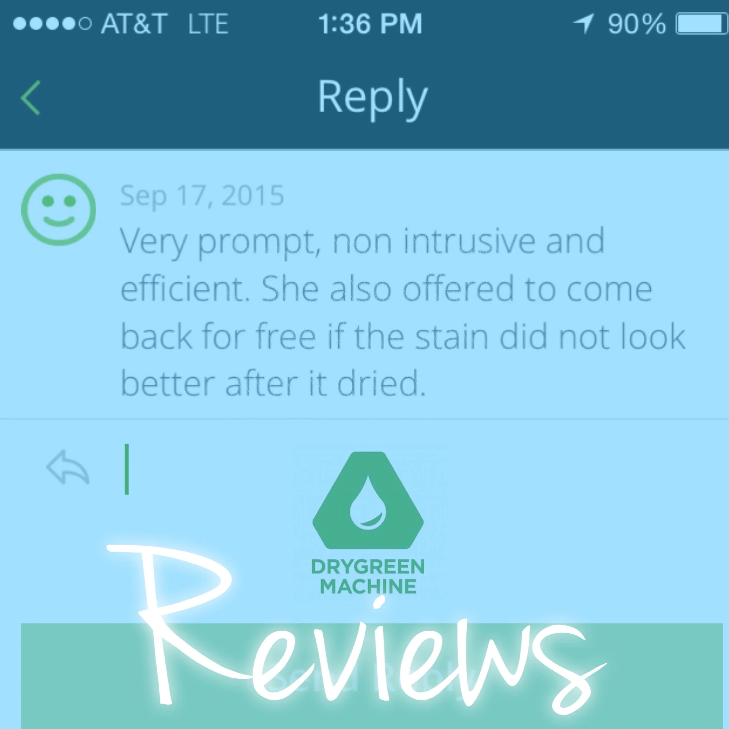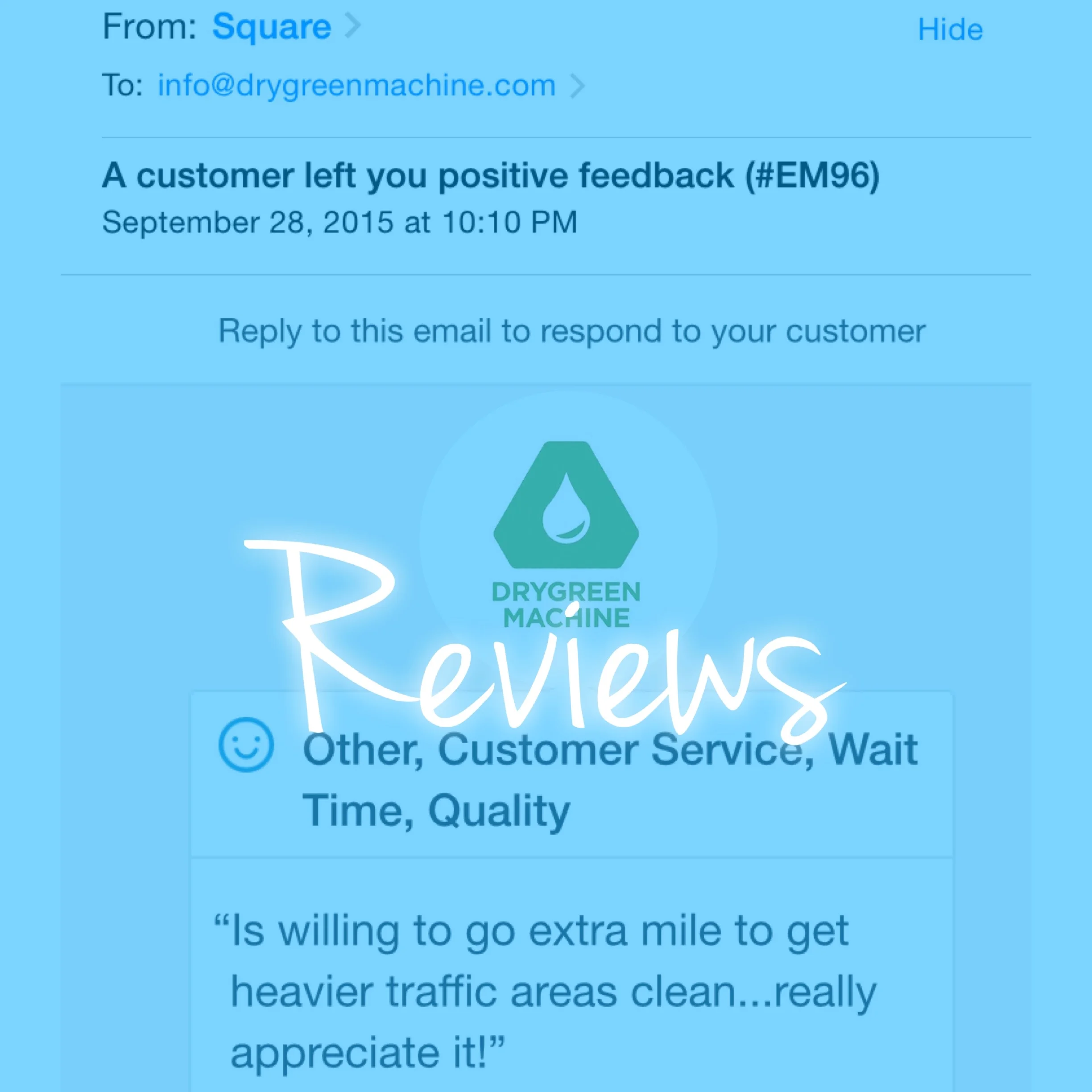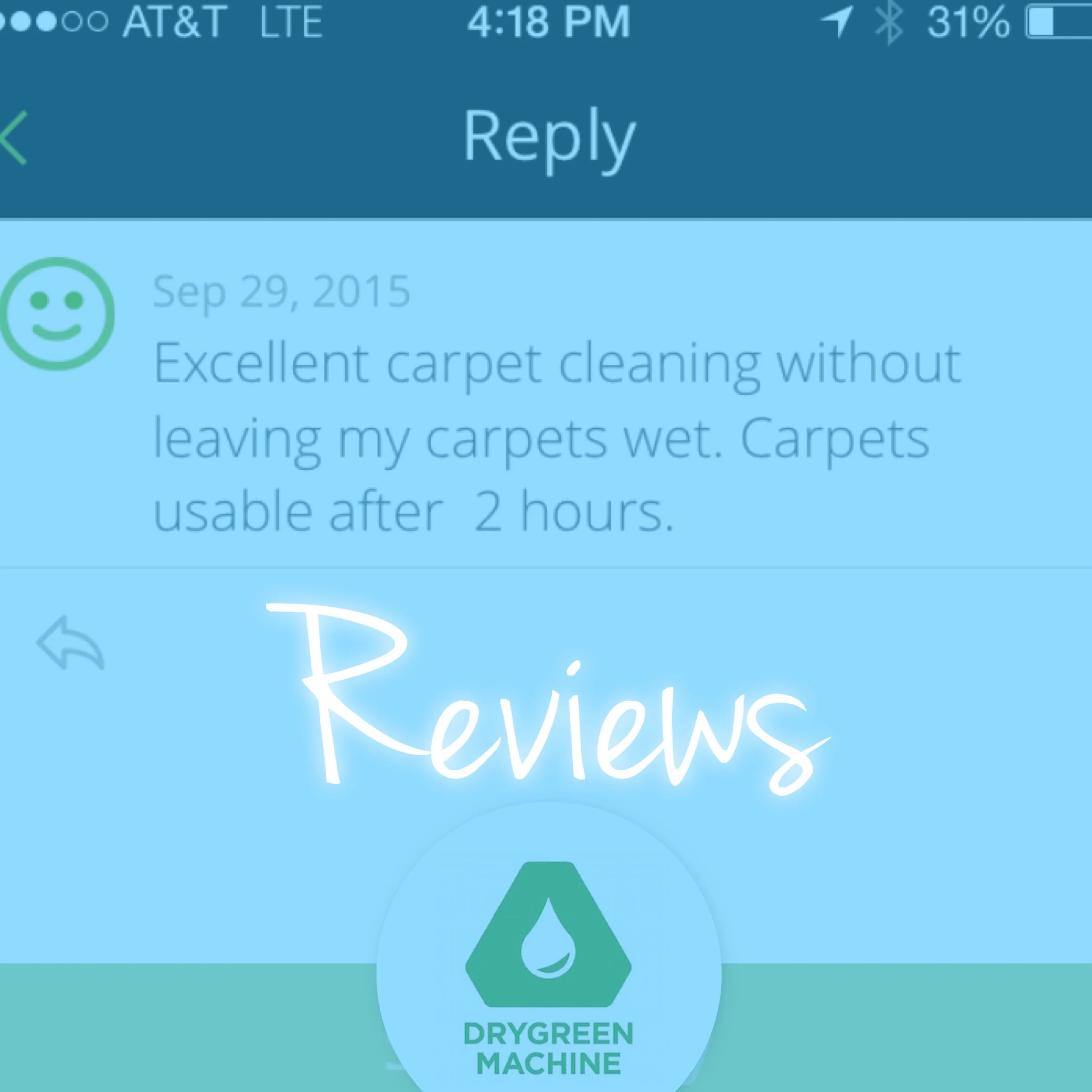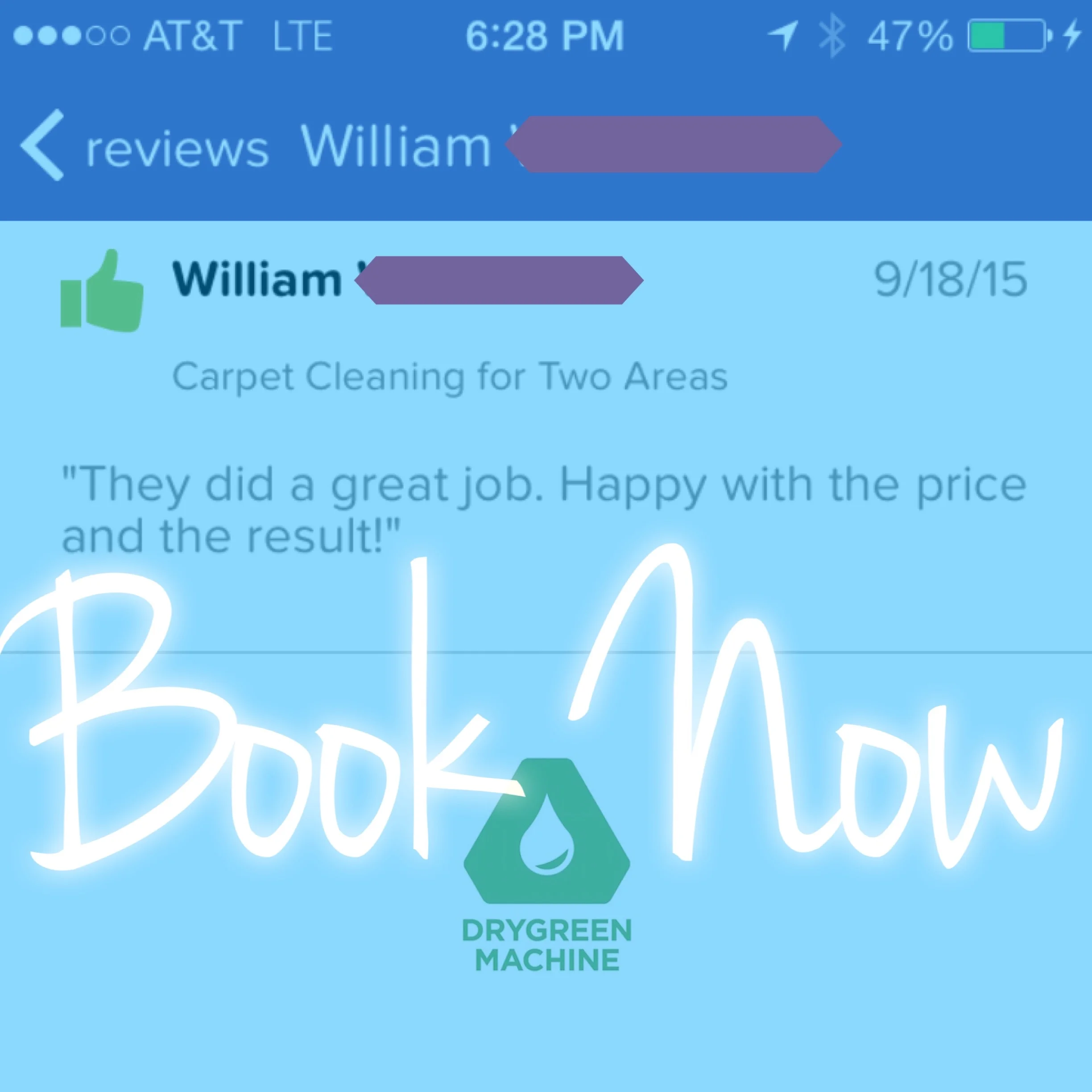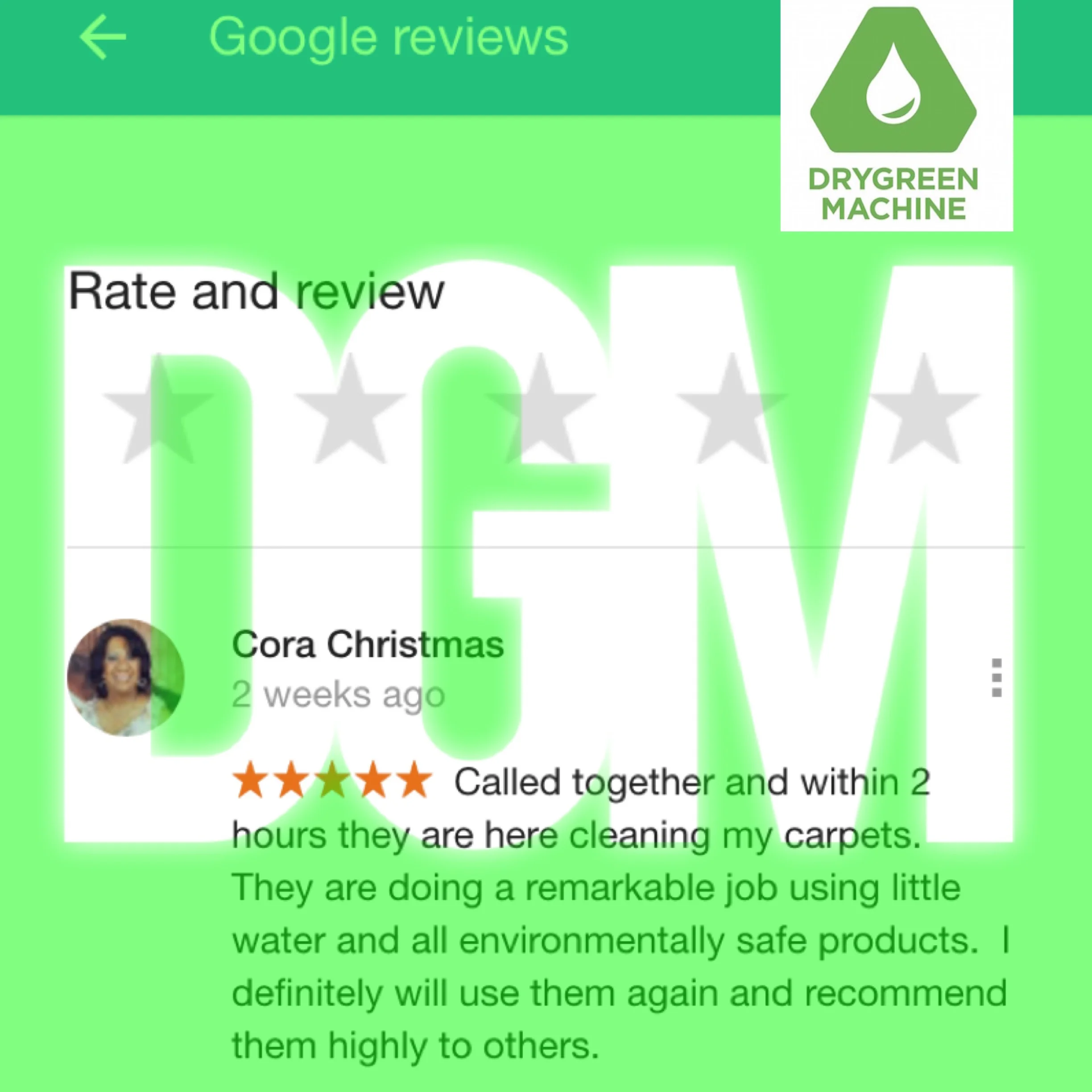 “I found DryGreen Machine online and held my breathe. Co-owner Mike came to my office and did a great job. The appointment was easy to book on-line, the reminders were timely and then a 30 minute out call were all greatly appreciated. My office looks great again. I will definitely use this company again for home and business!”