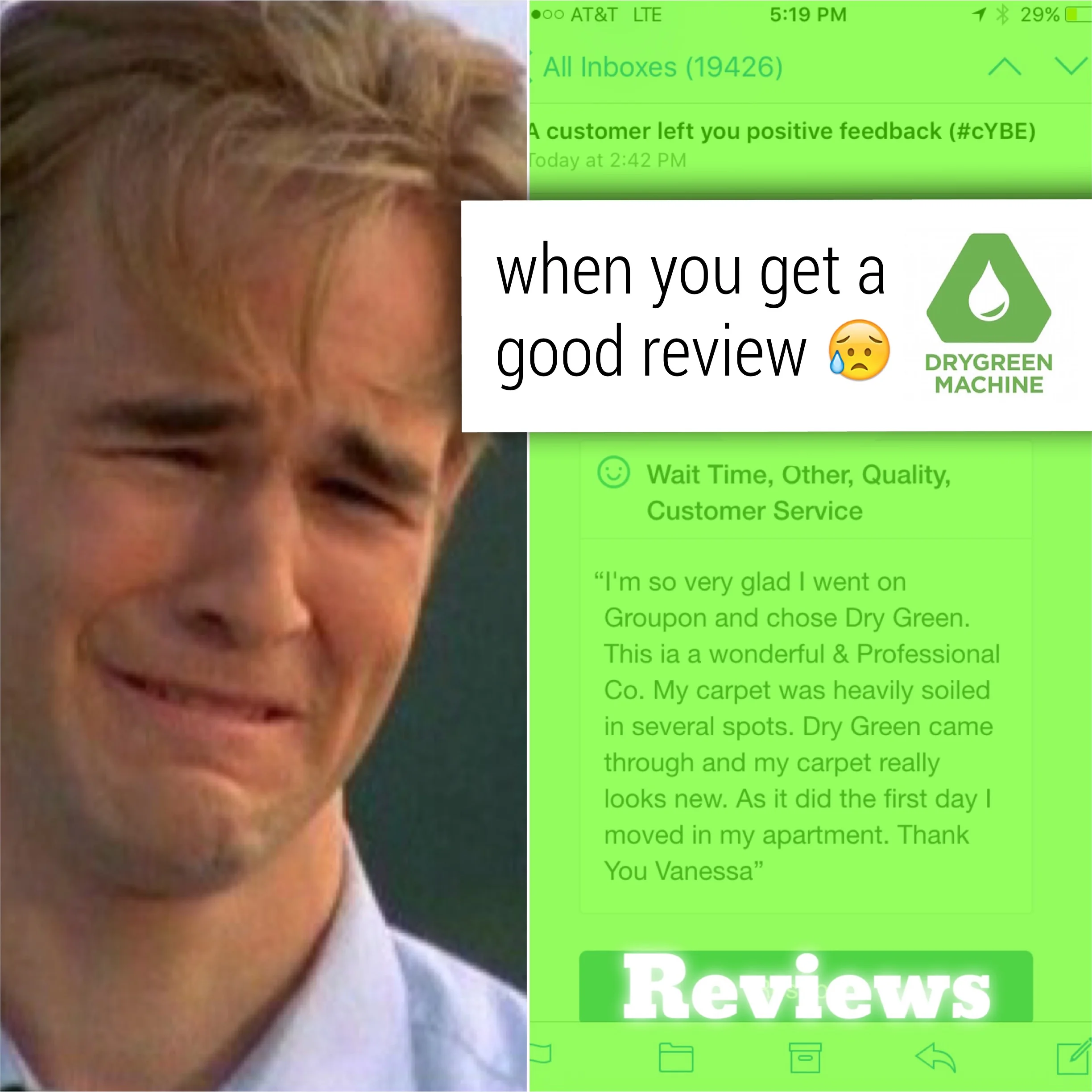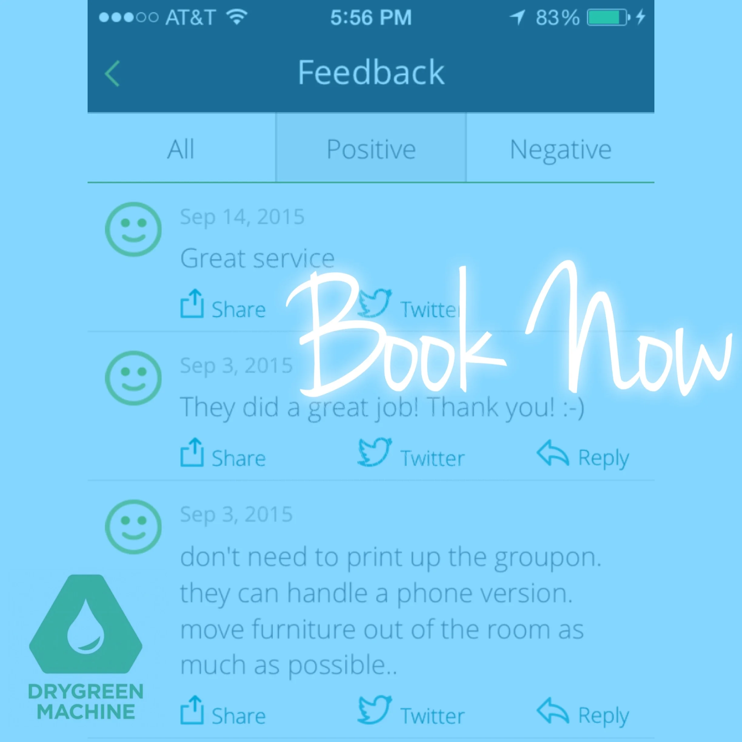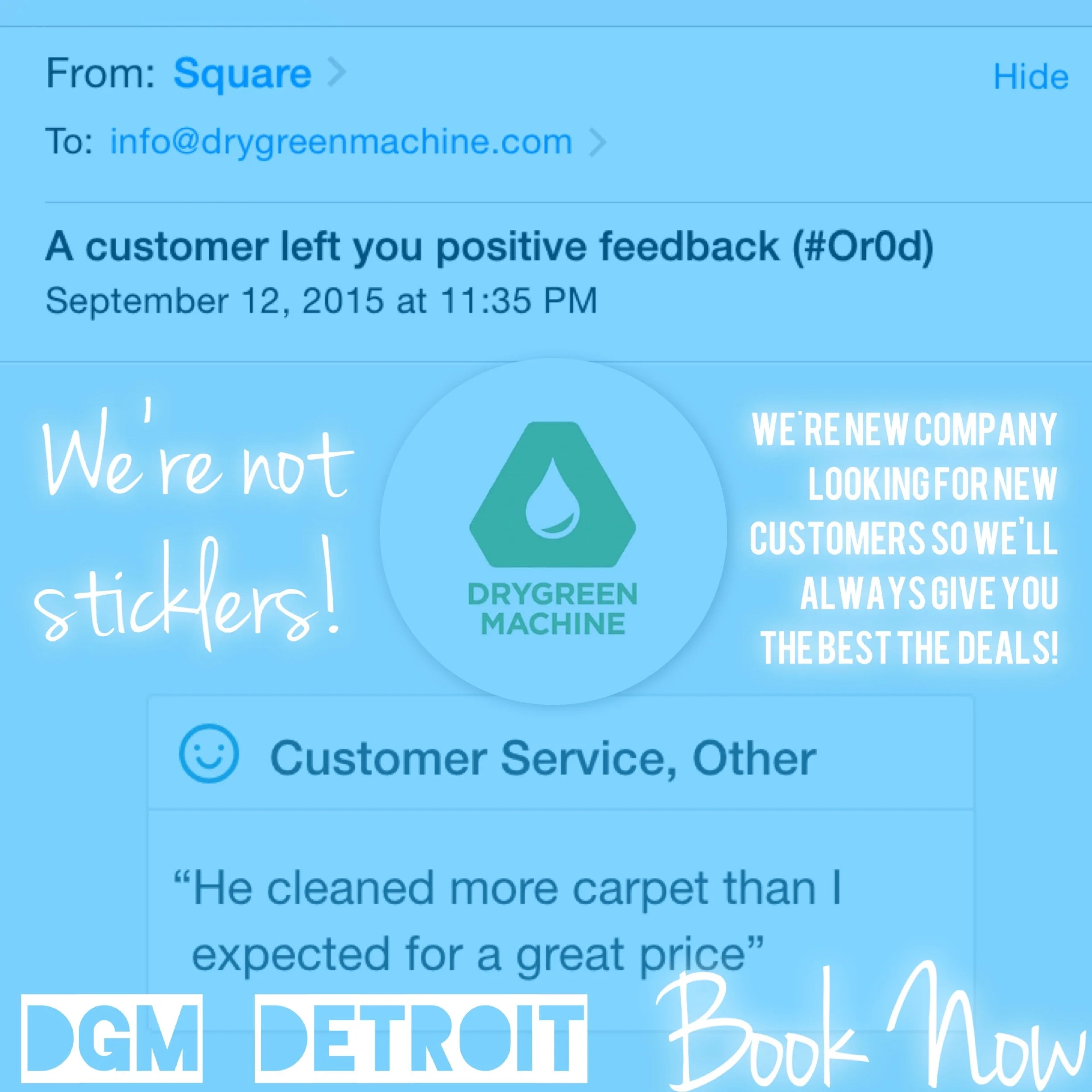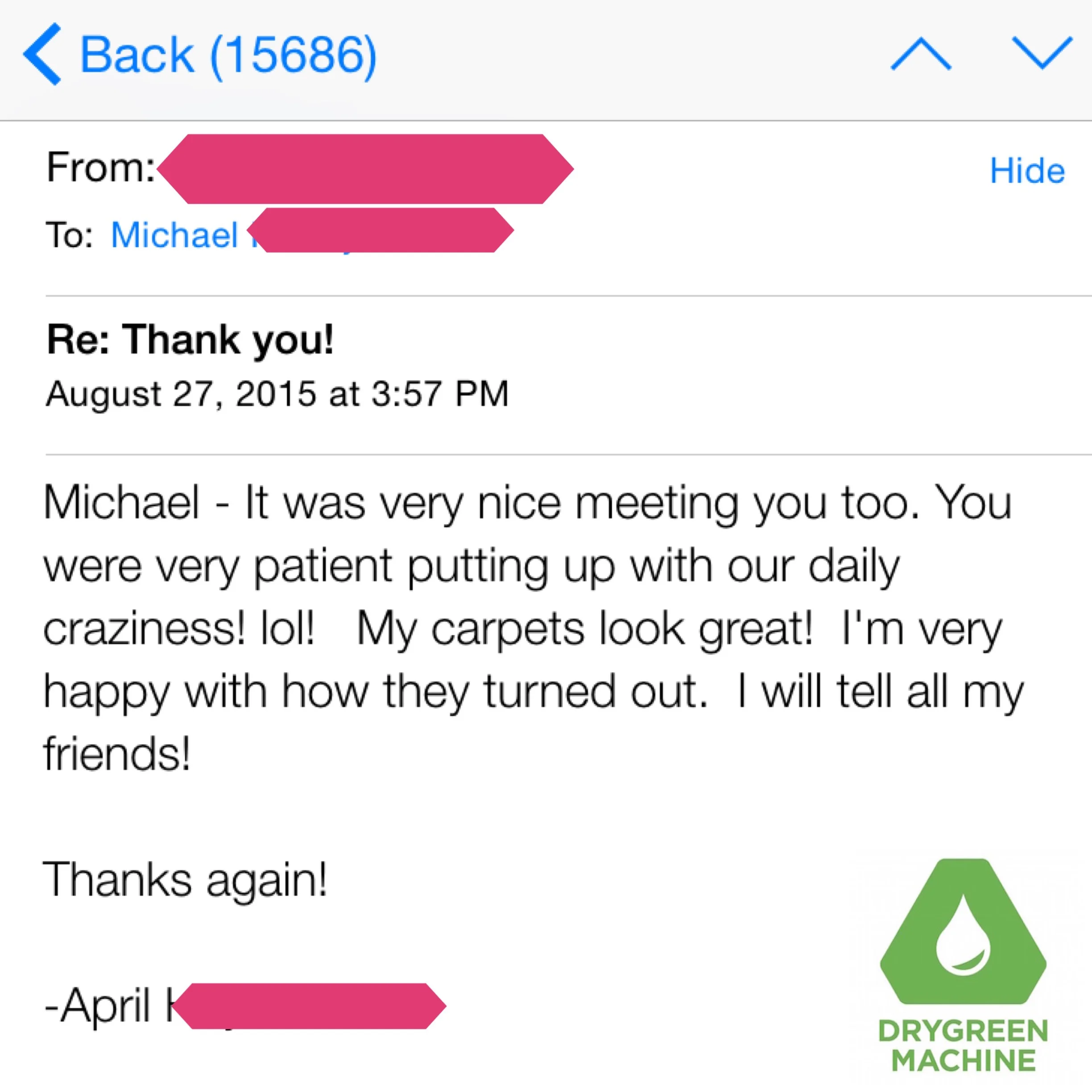 “I found DryGreen Machine online and held my breathe. Co-owner Mike came to my office and did a great job. The appointment was easy to book on-line, the reminders were timely and then a 30 minute out call were all greatly appreciated. My office looks great again. I will definitely use this company again for home and business!”